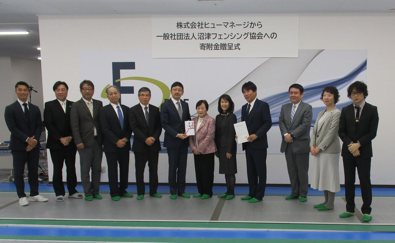 株式会社ヒューマネージからの寄付金贈呈式が3月12日、Bivi沼津3階F3BASEで行われました。株式会社ヒューマネージの齋藤社長は県フェンシング協会役員を長年務めた齋藤雅子様のご次男。長年の功労に対して各方面から表彰を受けたことに感謝し、フェンシング競技の発展を願って沼津フェンシング協会にご寄付されました。