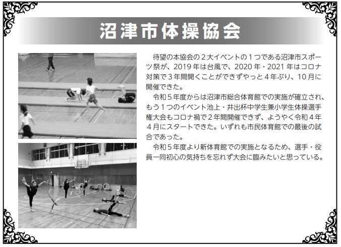 令和5年度からは沼津市総合体育館での実施が確立され、もう1つのイベント池上・井出杯中学生兼小学生体操選手権大会もコロナ禍で2年間開催できず、ようやく令和4年4月にスタートできた。いずれも市民体育館での最後の試合であった。