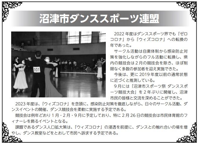 9 月には「沼津市スポーツ祭 ダンススポ ーツ競技大会」を 2 年ぶりに開催し、沼津 市民の皆様と交流を深めることができた。