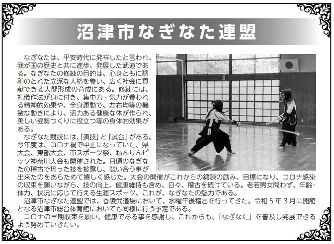 沼津市なぎなた連盟では、香陵武道場において、水曜午後稽古を行ってきた。令和 5 年 3 月に開館 となる沼津市総合体育館においても同様に行う予定である。