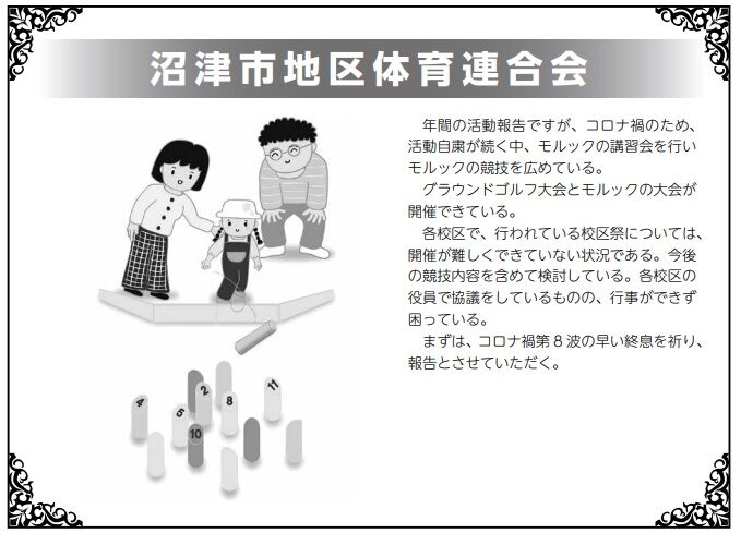 2022年01月29日 沼津市地区スポーツ連合会の紹介 年間の活動報告ですが、コロナ禍のため、 活動自粛が続く中、モルックの講習会を行い モルックの競技を広めている。 グラウンドゴルフ大会とモルックの大会が 開催できている。 各校区で、行われている校区祭については、 開催が難しくできていない状況である。今後 の競技内容を含めて検討している。各校区の 役員で協議をしているものの、行事ができず 困っている。 まずは、コロナ禍第 8 波の早い終息を祈り、 報告とさせていただく。 カテゴリなしの他の記事 < 前の記事次の記事 >