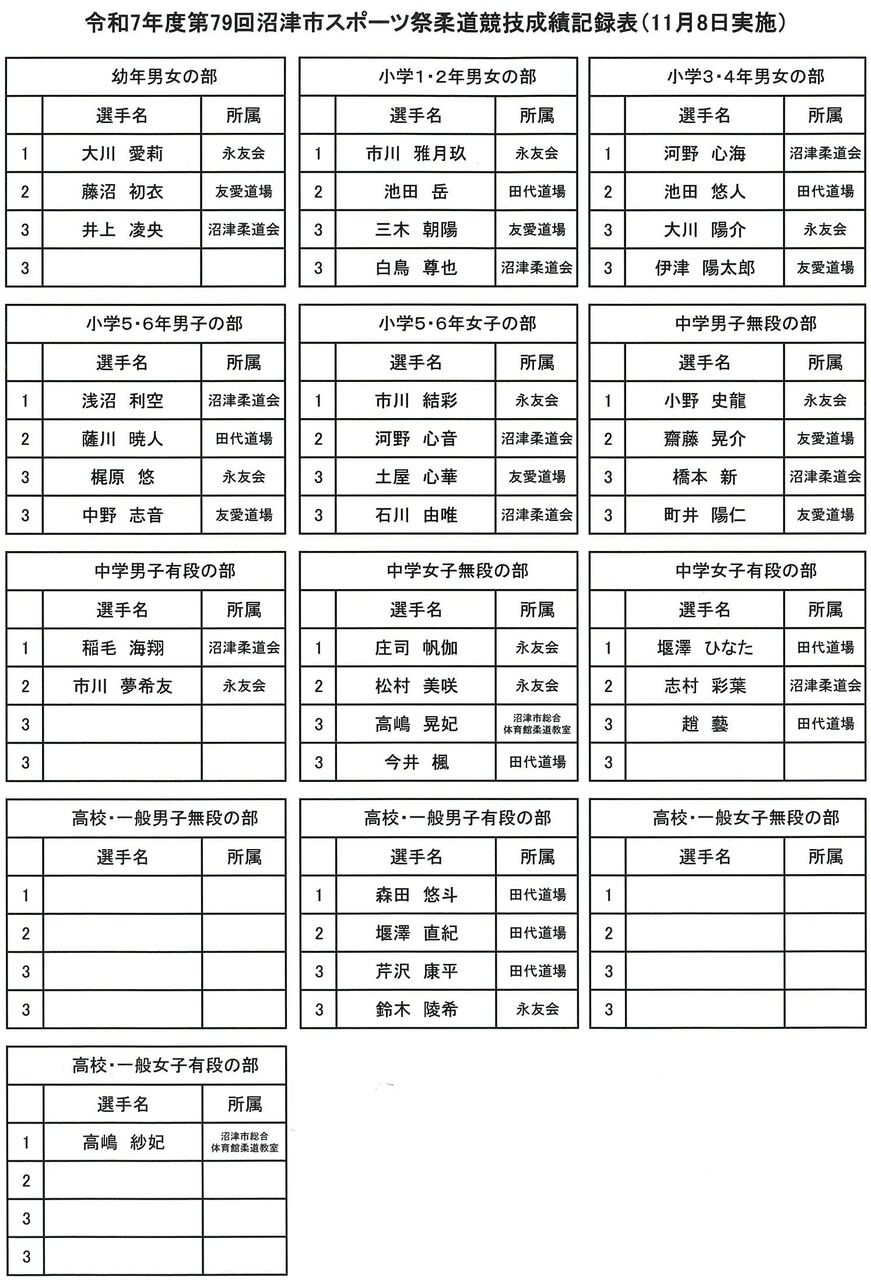 2025年11月20日 令和7年度沼津市スポーツ祭(柔道) 令和7年11月8日(土)沼津市総合体育館武道場にて「第79回沼津市スポーツ祭 柔道競技の部」が開催され84名の方が参加されました。 「沼津市スポーツ祭」カテゴリの最新記事 < 前の記事次の記事 >